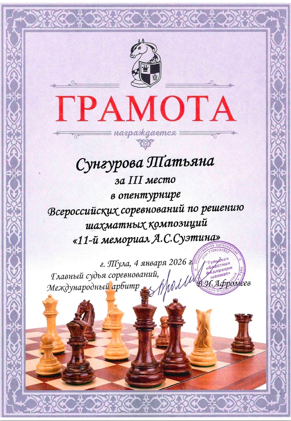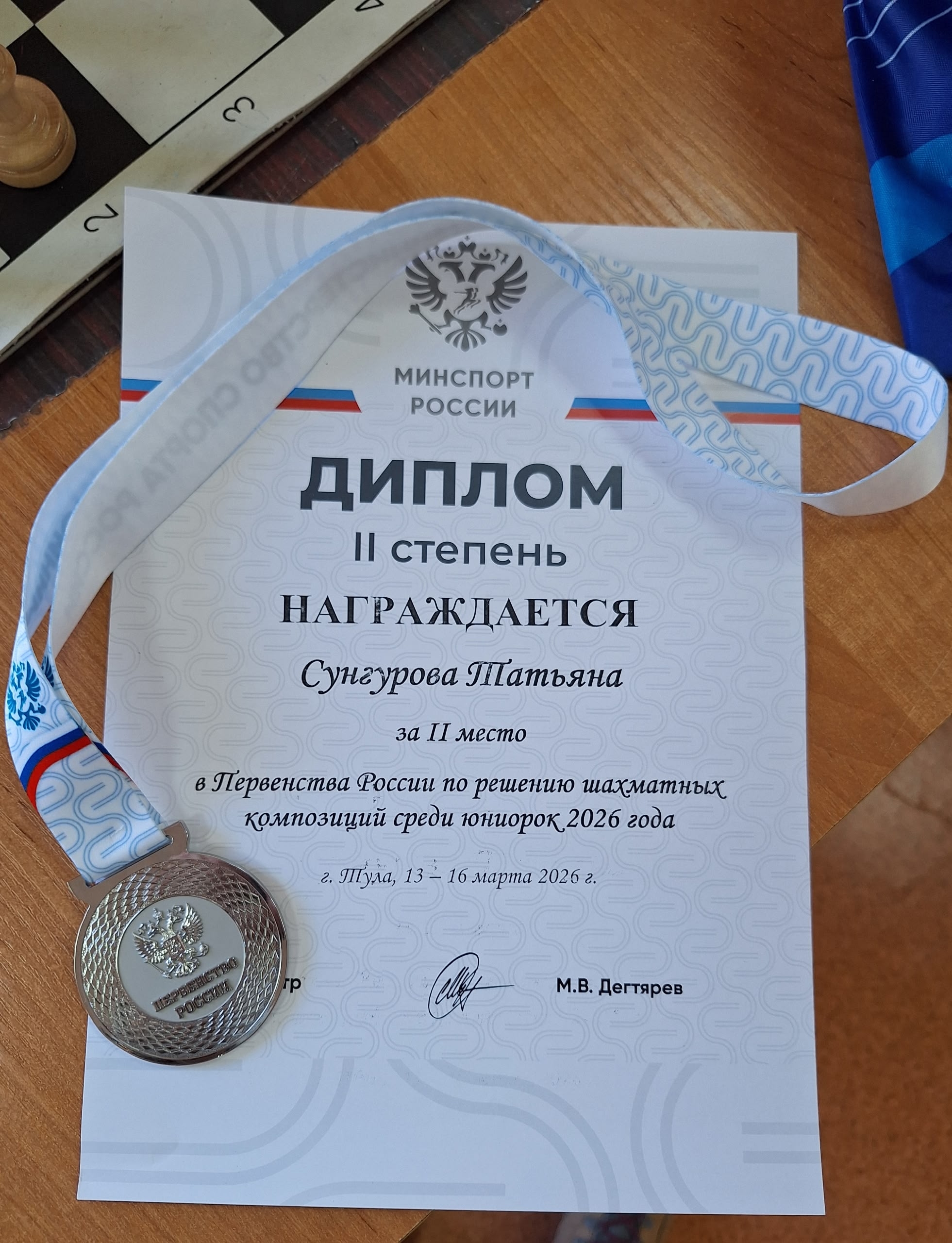 13 – 16 марта 2026 года в Туле прошло Первенство России по решению шахматных композиций среди юниоров и юниорок. Серебряную медаль среди юниорок завоевала кандидат в мастера спорта Сунгурова Татьяна (Ленинградская область). Также Татьяна заняла 1 и 3 места в опенах, которые проходили перед основным соревнованием!