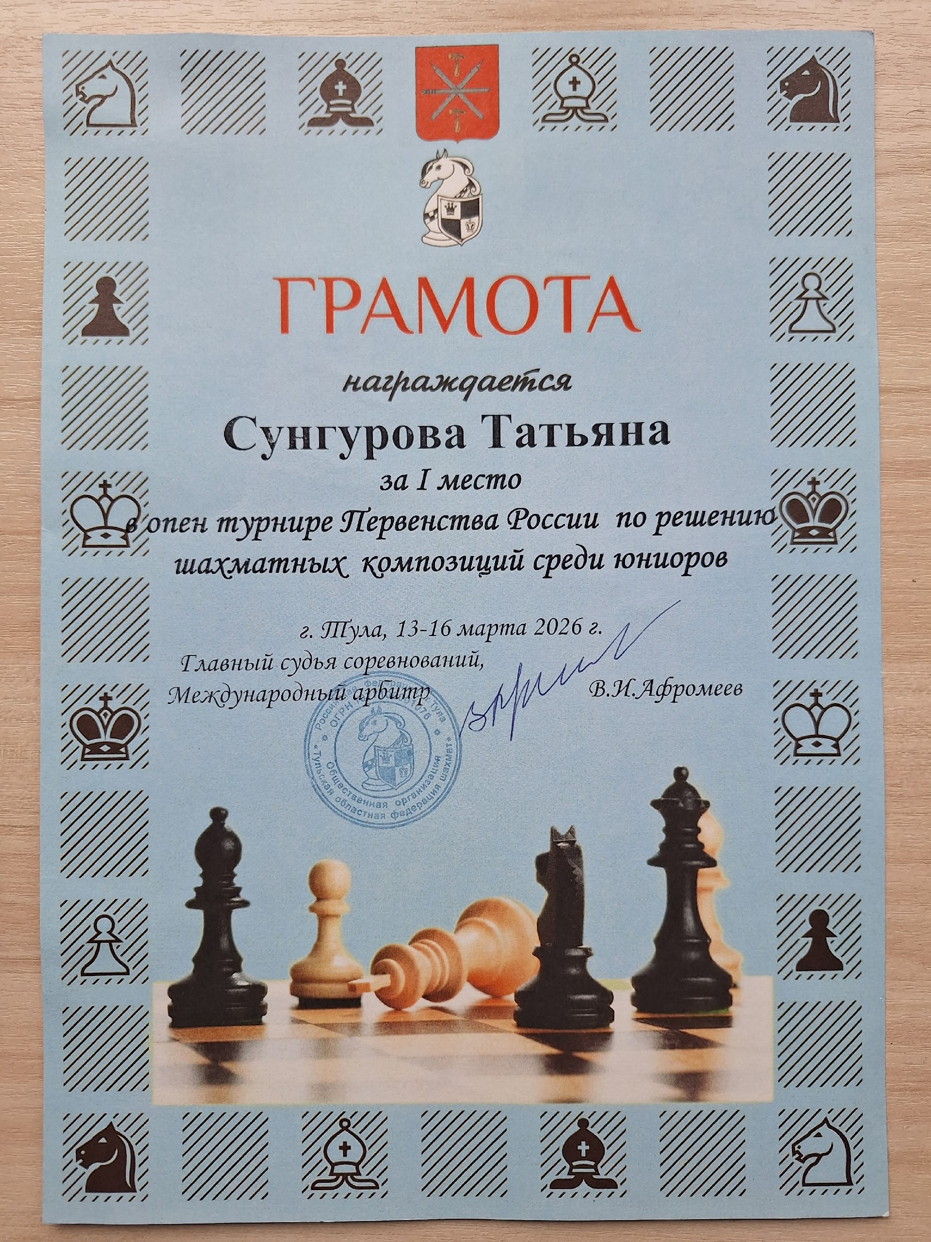 13 – 16 марта 2026 года в Туле прошло Первенство России по решению шахматных композиций среди юниоров и юниорок. Серебряную медаль среди юниорок завоевала кандидат в мастера спорта Сунгурова Татьяна (Ленинградская область). Также Татьяна заняла 1 и 3 места в опенах, которые проходили перед основным соревнованием!